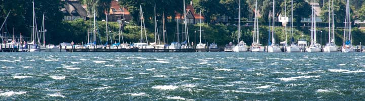 wirkt der Schwimmsteg als Wellenbrecher, und die Bootsrümpfe