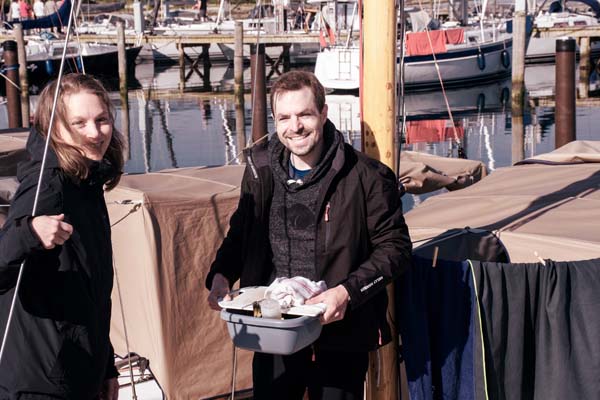 der Hafeneinfahrt winken Hille und Michael. Hille ruft: „Was