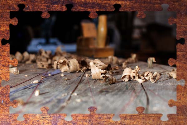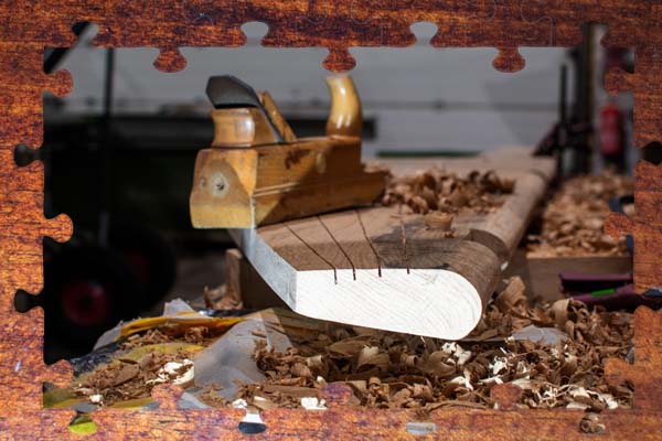 Stück Eiche liegt auf der Werkbank, darauf die alte Wrange.